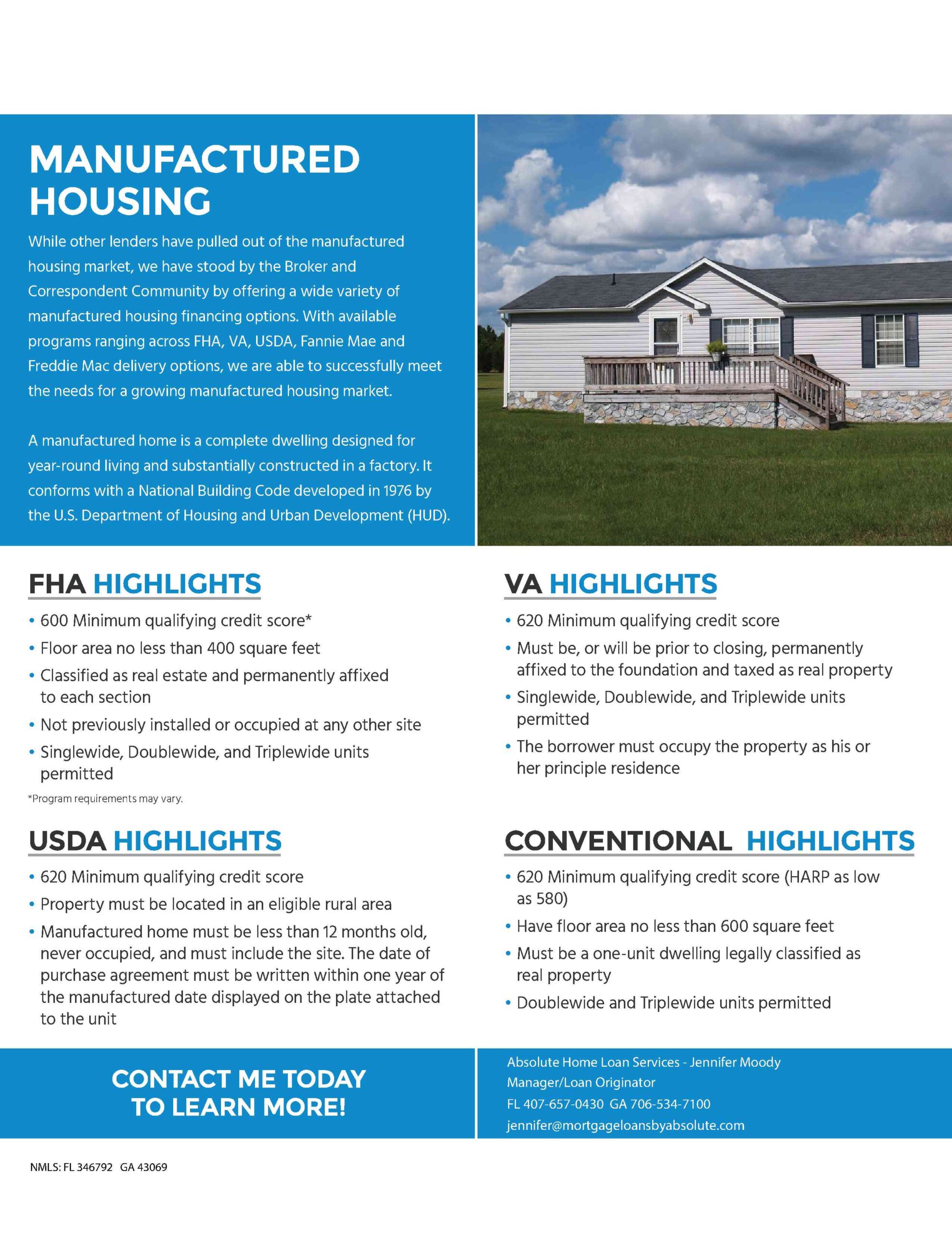 We offer traditional financing on manufactured and mobile homes, and also offer a "Construction Loan," in this category. This allows for the purchase of the home, the land, and costs incurred in moving the home and prepping the land, to also be financed. This "Construction Loan," is only available on brand new homes.